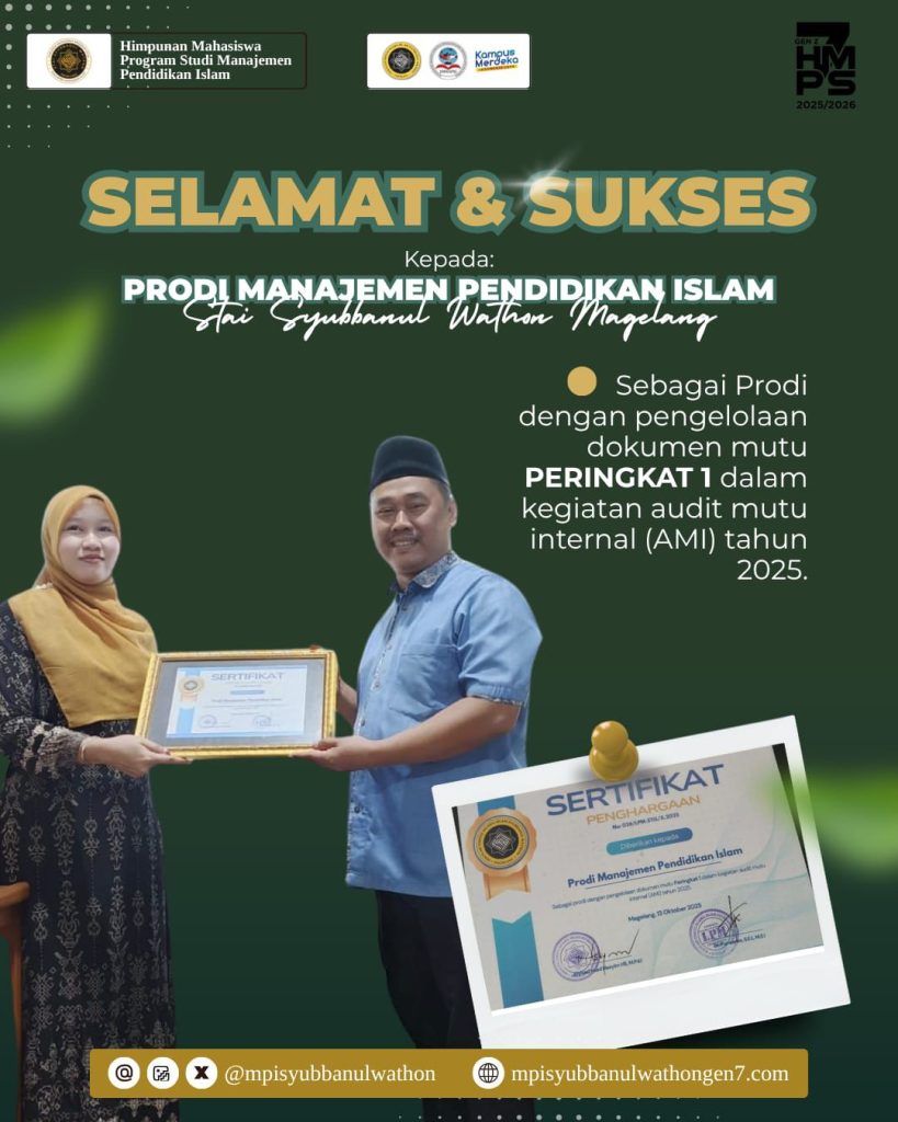Magelang, 18 Oktober 2025 – Prestasi membanggakan kembali ditorehkan oleh Program Studi Manajemen Pendidikan Islam (MPI) STAI Syubbanul Wathon Magelang. Dalam kegiatan Audit Mutu Internal (AMI) Tahun 2025, Prodi MPI berhasil meraih Peringkat 1 dalam Pengelolaan Dokumen Mutu, mengungguli program studi lainnya di lingkungan kampus.
